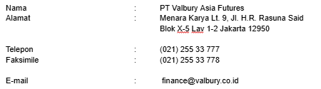 Apabila anda diminta untuk memberikan sesuatu kepada pihak PT Valbury Asia Futures di luar dari yang telah diperjanjikan dalam perjanjian resmi, mohon menghubungi customer service call +62 21 255 33 777 atau Helpdesk Email : cso@valbury.co.id.